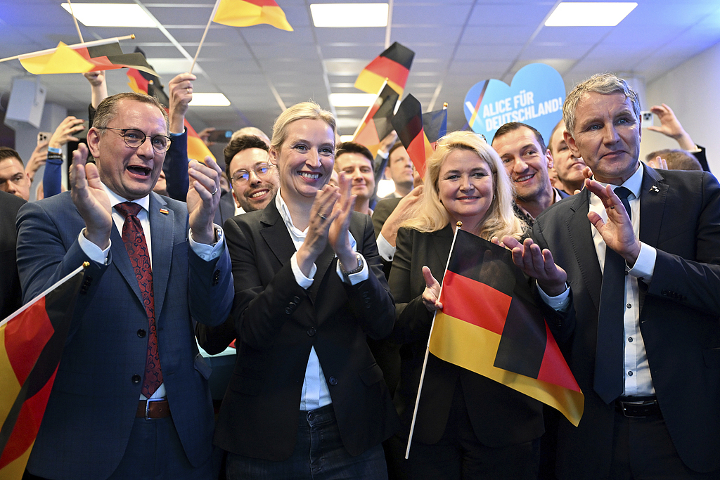 当地期间2025年2月23日,德国柏林,德国选定党(AFD)联邦主席候选东谈主艾莉斯·韦德尔(Alice Weidel,中间)、AFD联邦主席蒂诺·赫鲁帕拉(Tino Chrupalla,左)、克里斯丁·布林克(Kristin Brinker,AFD)和比尔恩·赫克(Björn Höcke,右)在AFD联邦办公室参加AFD选举约会,对德国联邦议会第21届提前选举发表反应。视觉中国 图