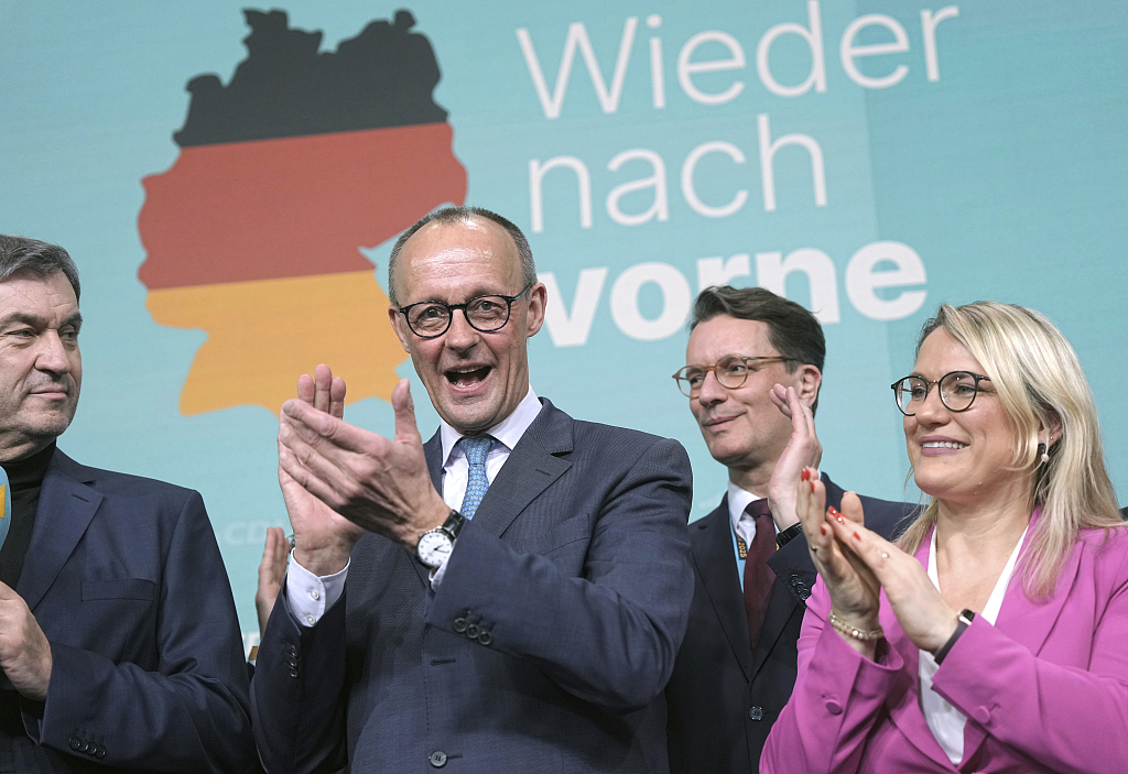 当地期间2025年2月23日,德国柏林,基督教民主定约(CDU)联接东谈主弗里德里希·梅茨在党总部向支捏者致辞并饱读掌,庆祝德国世界选举的成果。视觉中国 图